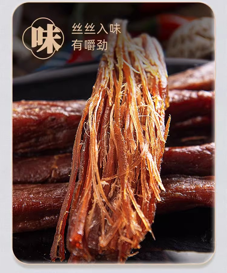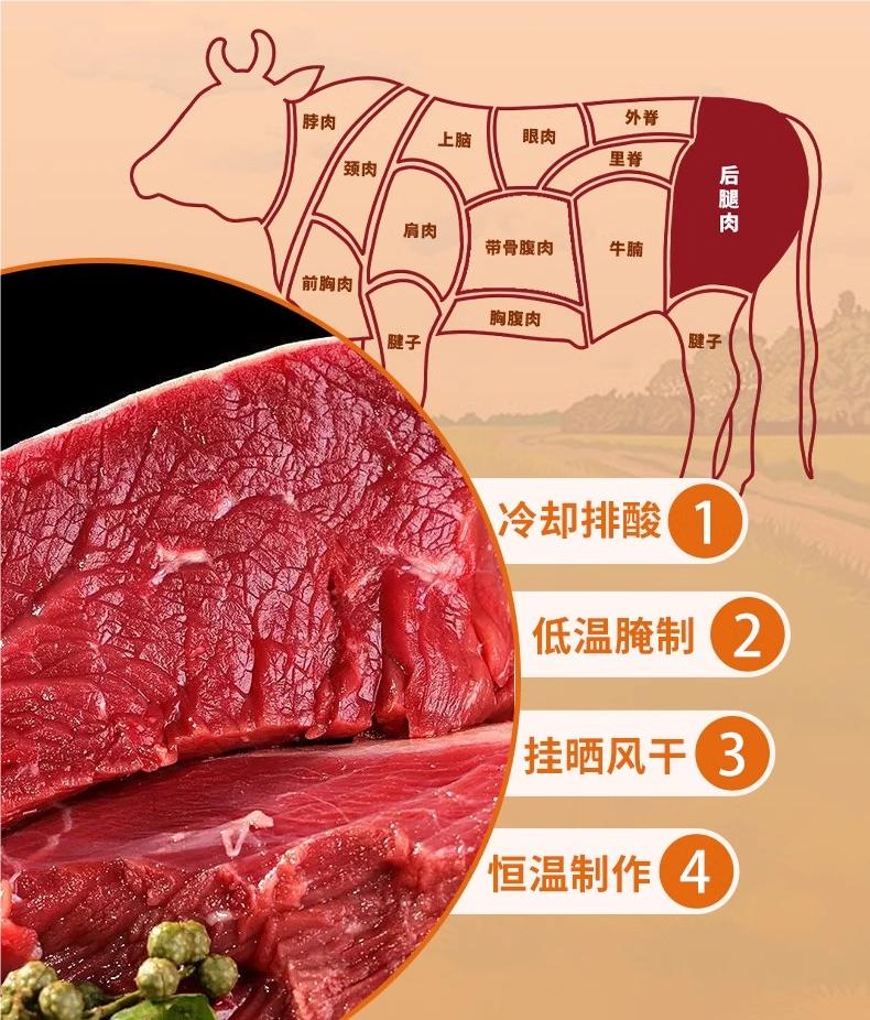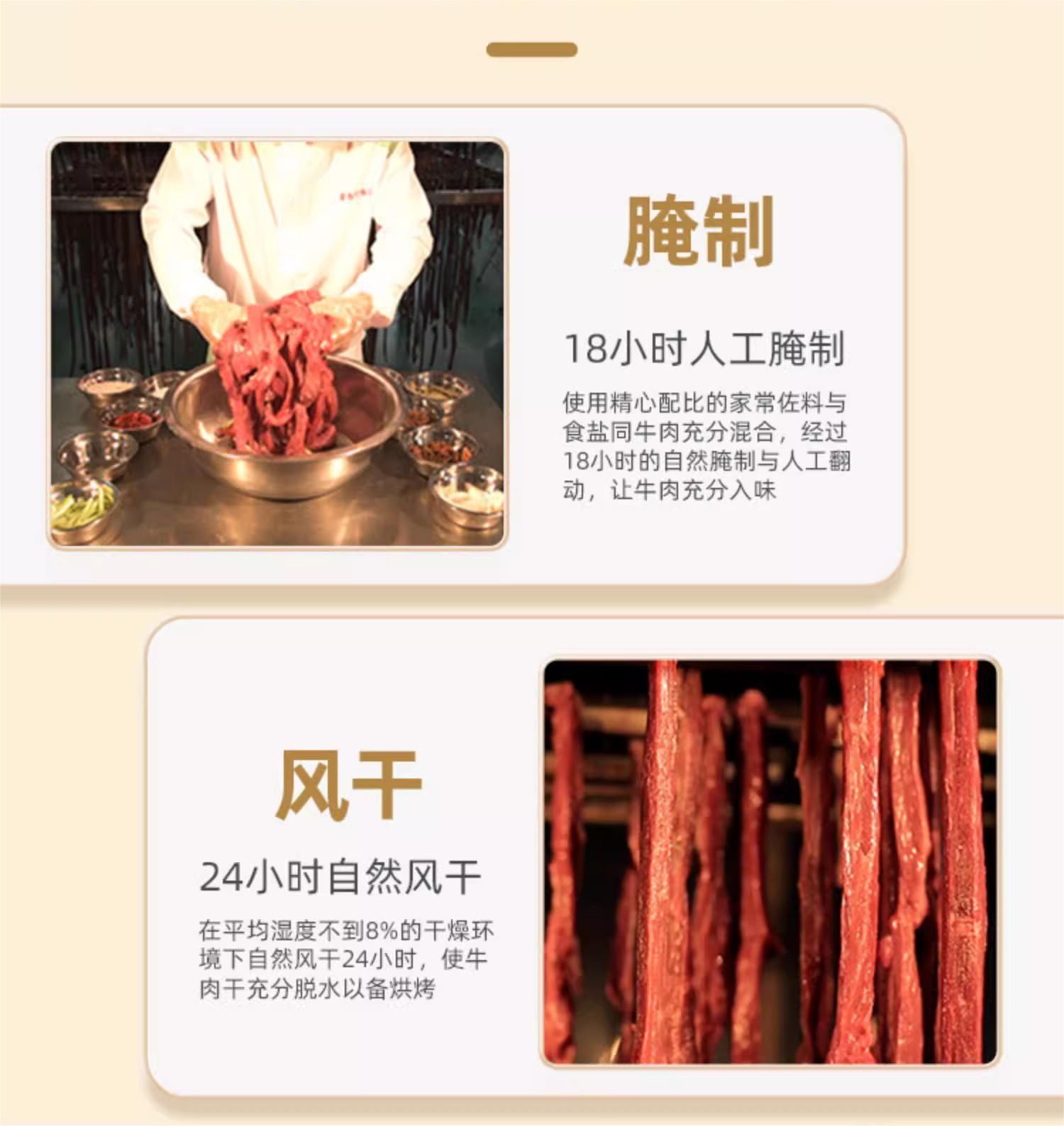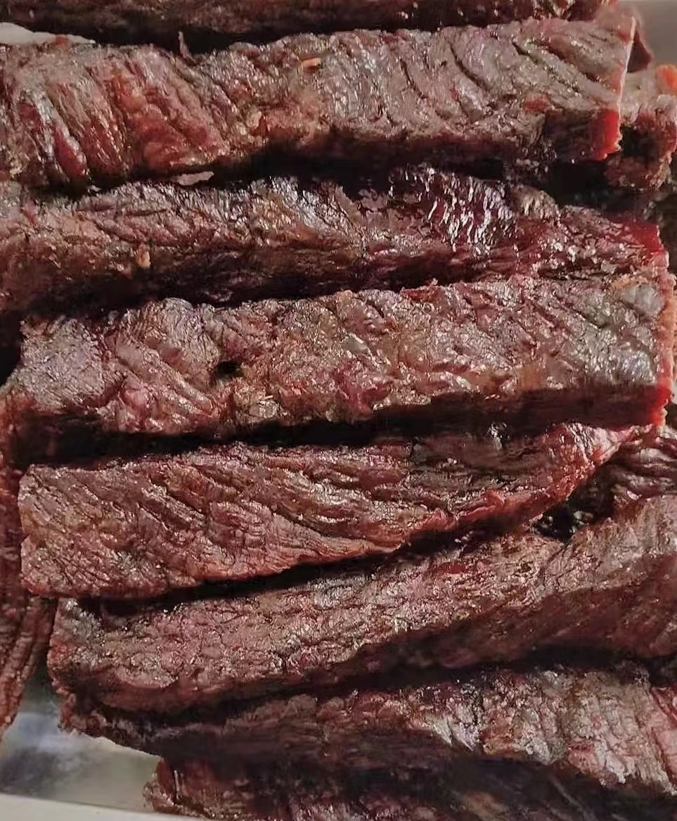 經(jīng) 48 小時(shí)冷卻排酸、8 小時(shí)低溫腌制、24 小時(shí)掛曬風(fēng)干、40 分鐘恒溫制作。7 成干度適中,既避免過(guò)硬咬不動(dòng),又保證嚼勁,紋理清晰、絲絲入味,入口不硬不柴,越嚼越香,大人小孩老人都能吃。