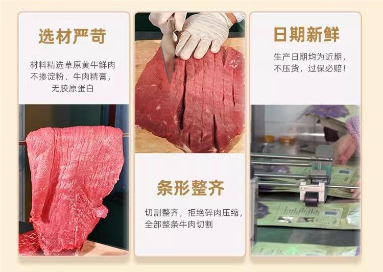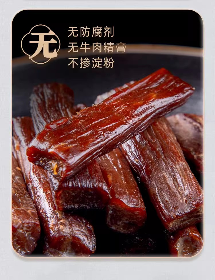 精選內(nèi)蒙古草原散養(yǎng)黃牛里脊、米龍等 “黃金肉條” 部位,24-36 個(gè)月育成,牛兒飲天然泉水、食百草。配料表干凈,無(wú)防腐劑、無(wú)牛肉精膏、不摻淀粉,3 斤鮮牛肉僅出 1 斤肉干,確保肉質(zhì)純正。